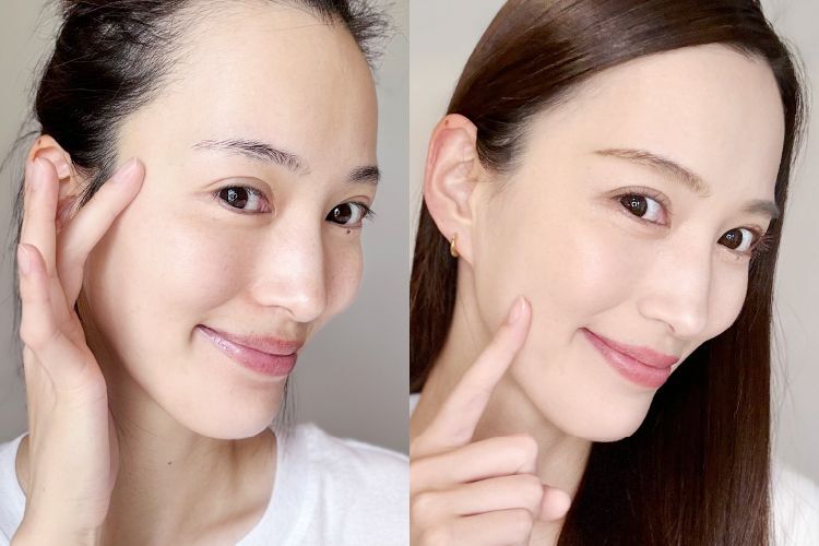 さらさらしているのに肌に吸い付く感じでしっとり!美容液は少し粘着力のあるテクスチャー!頬にもツヤが!